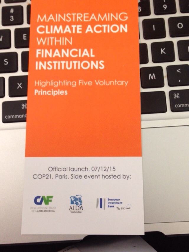 ERl documento de los principios fue presentado en el evento y puede consultarse en la siguiente dirección: http://www.eib.org/projects/priorities/climate-action/road-to-paris/fi-climate-mainstreaming.htm