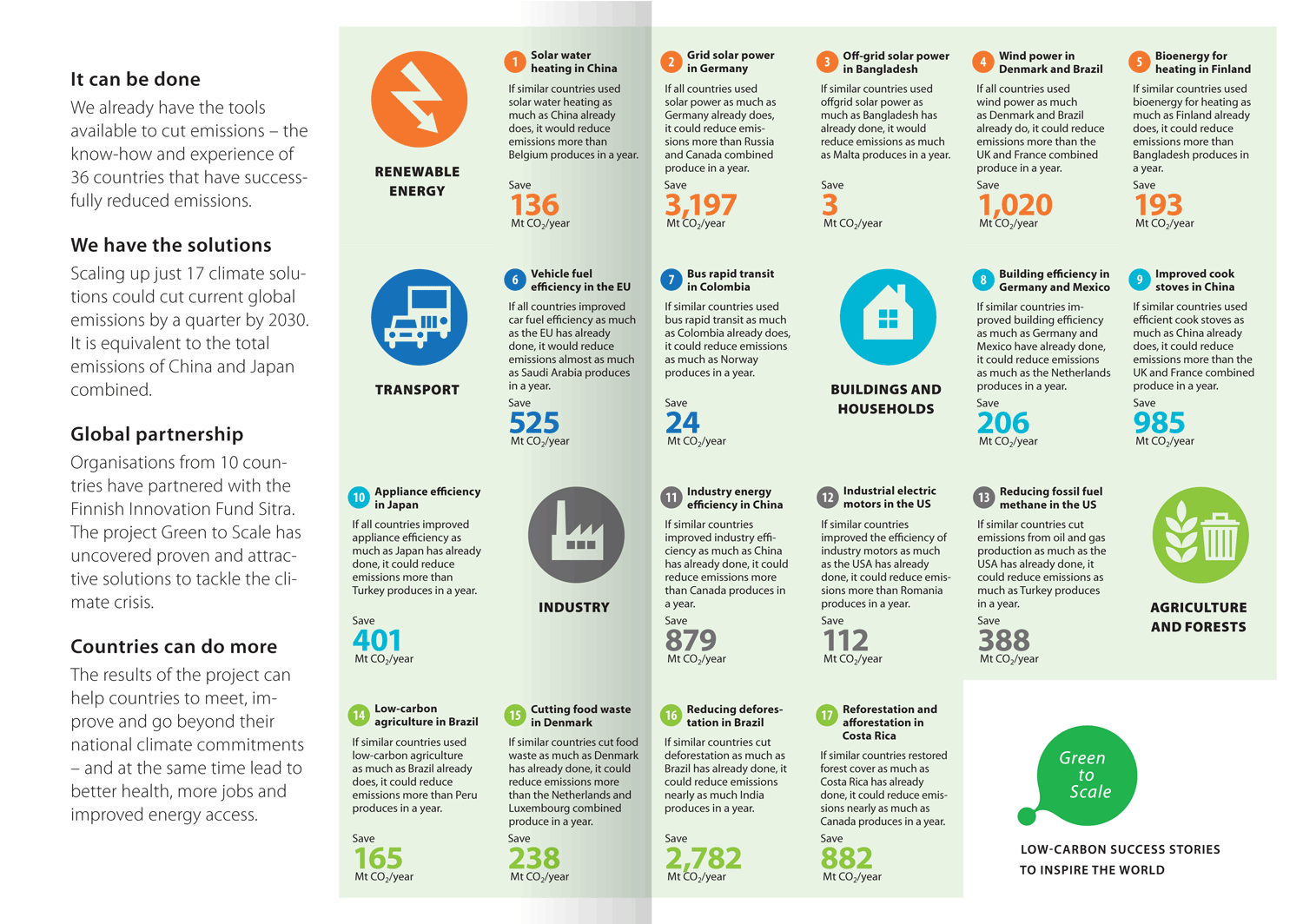 Las medidas evaluadas en el reporte abarcan los sectores de energías renovables, eficiencia energética, transporte, industria, agricultura, bosques y vivienda, se desarrollan tanto en el Norte como en el Sur y van desde la eficiencia energética en la industria en China y la reducción de los desperdicios de comida en Dinamarca, hasta la disminución de la deforestación en Brasil, el uso de bioenergía en Finlandia y la NAMA de vivienda en México. Los resultados del proyecto pueden apoyar a otros países a cumplir, mejorar e ir más allá de sus compromisos nacionales en materia de cambio climático, al tiempo que llevan a mejorar la salud, el empleo y el acceso de energía en sus territorios.