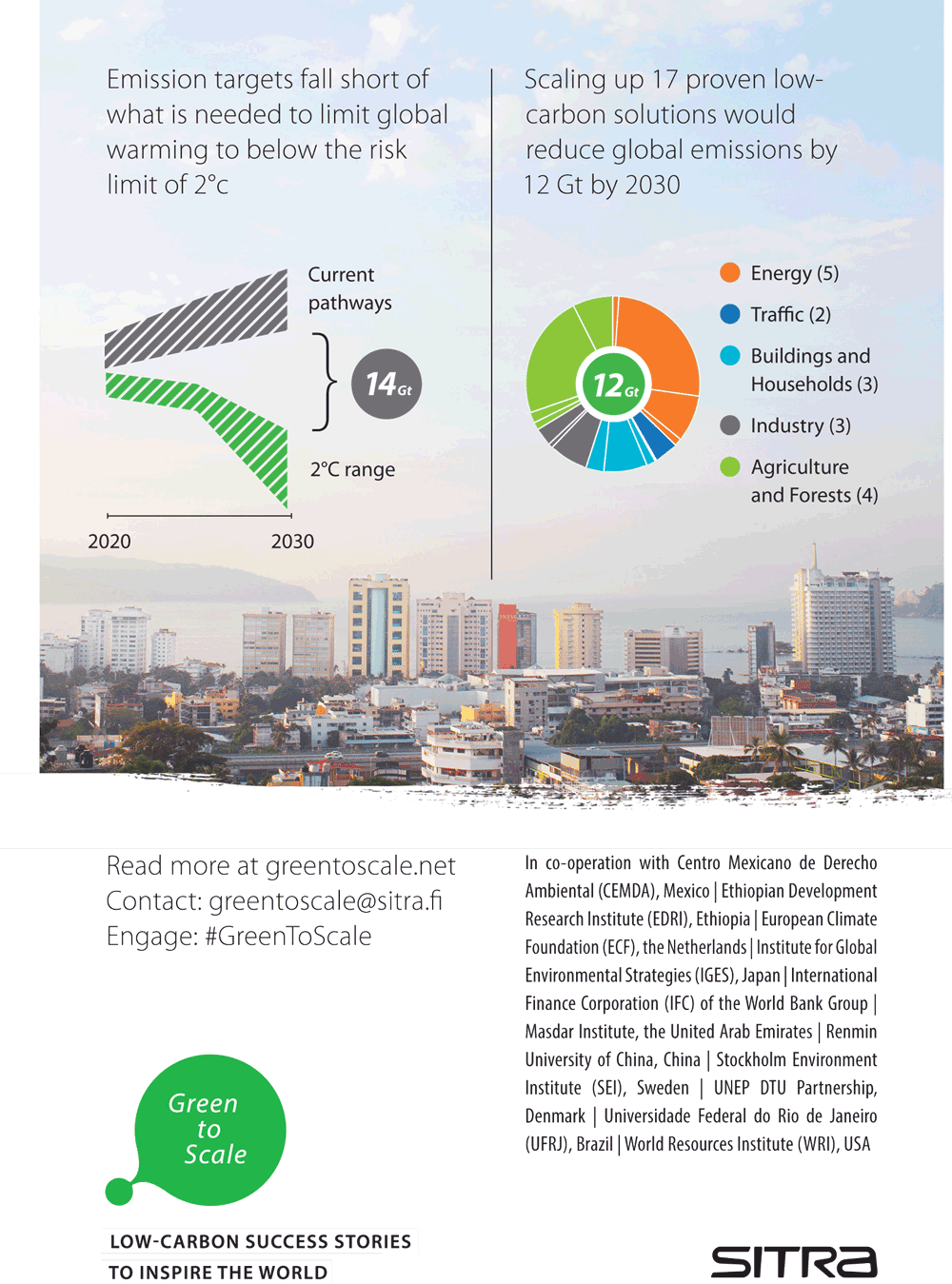 La ciencia indica que es cada vez más urgente y necesaria la implementación de medidas ambiciosas a nivel internacional, nacional y local. Durante dos eventos paralelos celebrados en la sede de la COP21, Sitra, el Fondo de Innovación Finlandés, presentó el reporte titulado Green to Scale, desarrollado con el apoyo de aliados internacionales de diez diferentes países, incluyendo al Centro Mexicano de Derecho Ambiental (CEMDA), acerca del potencial de aumentarlas soluciones de bajo carbono alrededor del mundo. El reporte demuestra que ya existen las herramientas necesarias para reducir emisiones, implementando tan sólo 17 soluciones para el cambio climático ya probadas en diversos países, lo que podrá reducir un cuarto de las emisiones actuales para 2030.