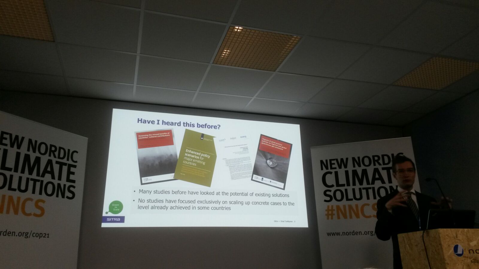 El Segundo evento paralelo se llevó a cabo el 9 de diciembre de 2015, donde Oras Tynkkynen, asesor senior de Sitra, presentó el reporte previamente mencionado. A pesar de que muchos estudios han analizado el potencial de soluciones existentes, ninguno otro como éste se había enfocado exclusivamente en el aumento de la ambición de los casos al nivel ya alcanzado en algunos países. Las 17 medidas identificadas son las más costo-efectivas a nivel mundial y lograrían reducir 12Gt de CO2 para 2030, lo que reduciría la brecha de emisiones necesarias para cumplir con la meta de que el aumento de la temperatura media global no supere los 2°C para final del siglo. Esto equivale a un cuarto de las emisiones actuales combinadas de China y Japón.